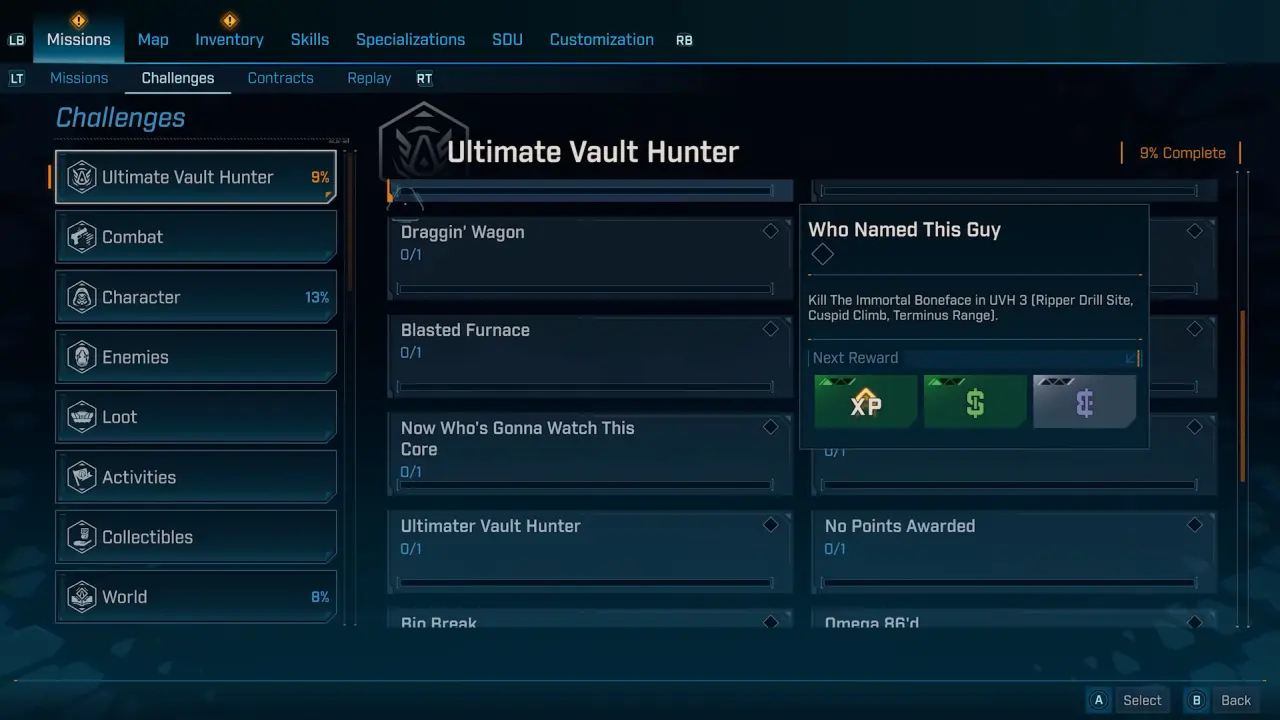 『ボーダーランズ4』では、ゲームを開始してすぐに様々なチャレンジ目標が提示され、目標を達成することで報酬を獲得することができる。チャレンジのカテゴリは戦闘から戦利品、キャラクター関連など多岐にわたる。