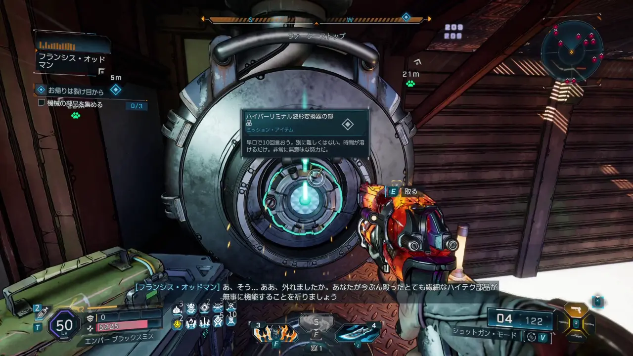 施設に入ったらフランシス・オッドマンと話し、装置の替えのパーツを取りに骨見海岸東端にある「ウォーターストップ」へ行く。現地に着いたら3か所にある設備のカバーを殴って外し、中にあるハイパーリミナル波形変換器を改修する。周囲では多数のオーダー兵が湧くが、倒さなくても目標は進められる。