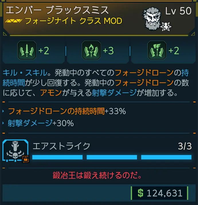 クラスMODのブラックスミスでドローン3種を維持し、触れなば死なんの効果でキル・スキルをバンバン発動させていくビルドです。
