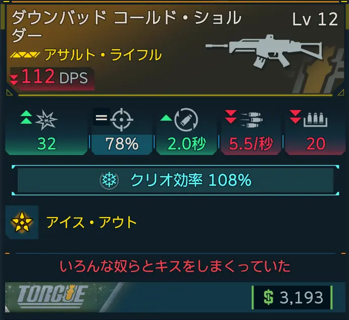 クリオ効率が高いので、弱い敵であれば簡単に凍る。ただし弾道があまり安定しないのでやや使いにくい。