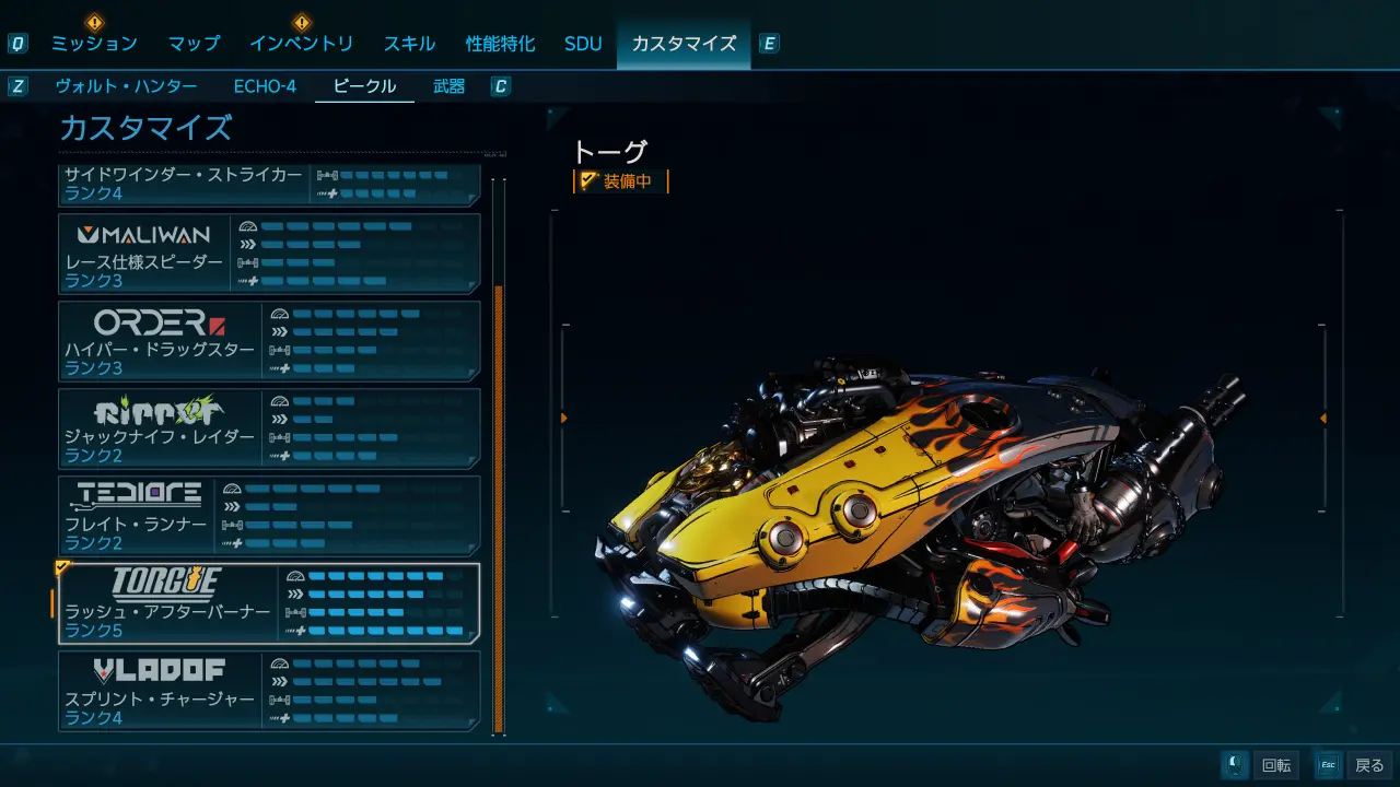 各ビークル自体には性能差がなく、スピード、加速度、操作性、ブーストといった各種ステータスはホバー・ドライブによって変化する。ホバー・ドライブはエコー・メニューから開けるビークルのカスタマイズから選択できる。