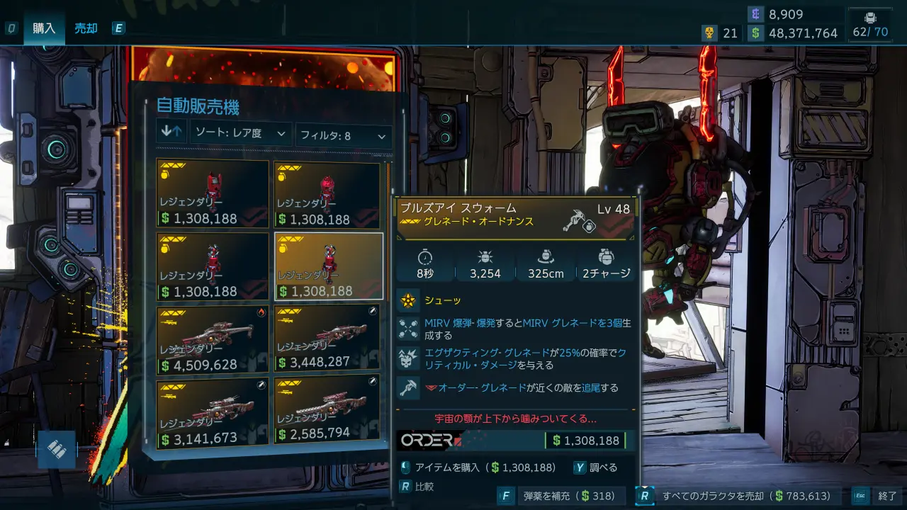 ブラックマーケット自動販売機にはランダムなレジェンダリー装備が2種、各種4個ずつの合計8個が陳列される。陳列される装備はキャラクターごとに異なるため、複数のキャラクターを作成したり、マルチプレイで他のプレイヤーと協力したりすることで、目当ての装備を探しやすくなる。
