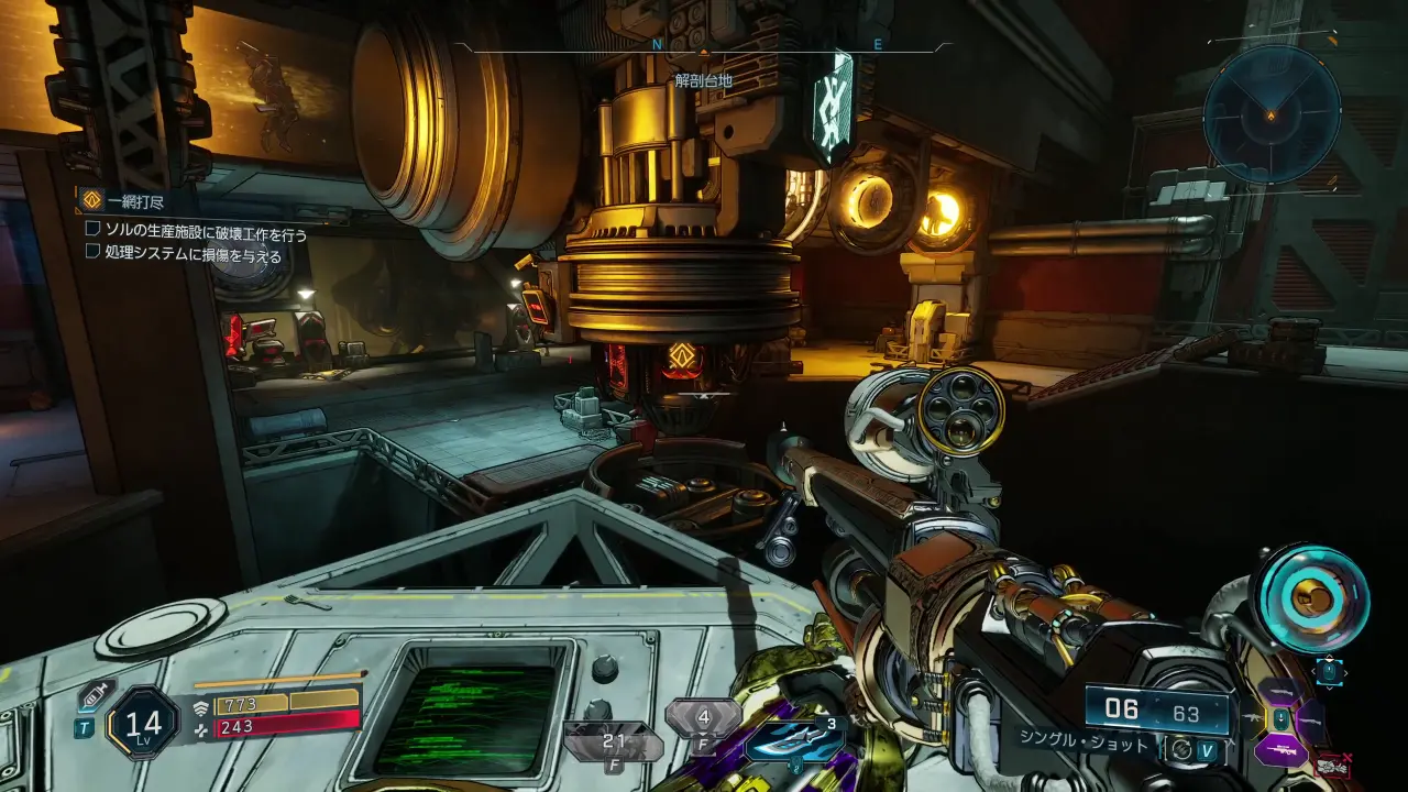 ある程度進むと生産ラインをハッキングするよう言われるので、近くの端末をインタラクトする。その後、生産を妨害するためにシンスプロセッサを破壊しに行く。
