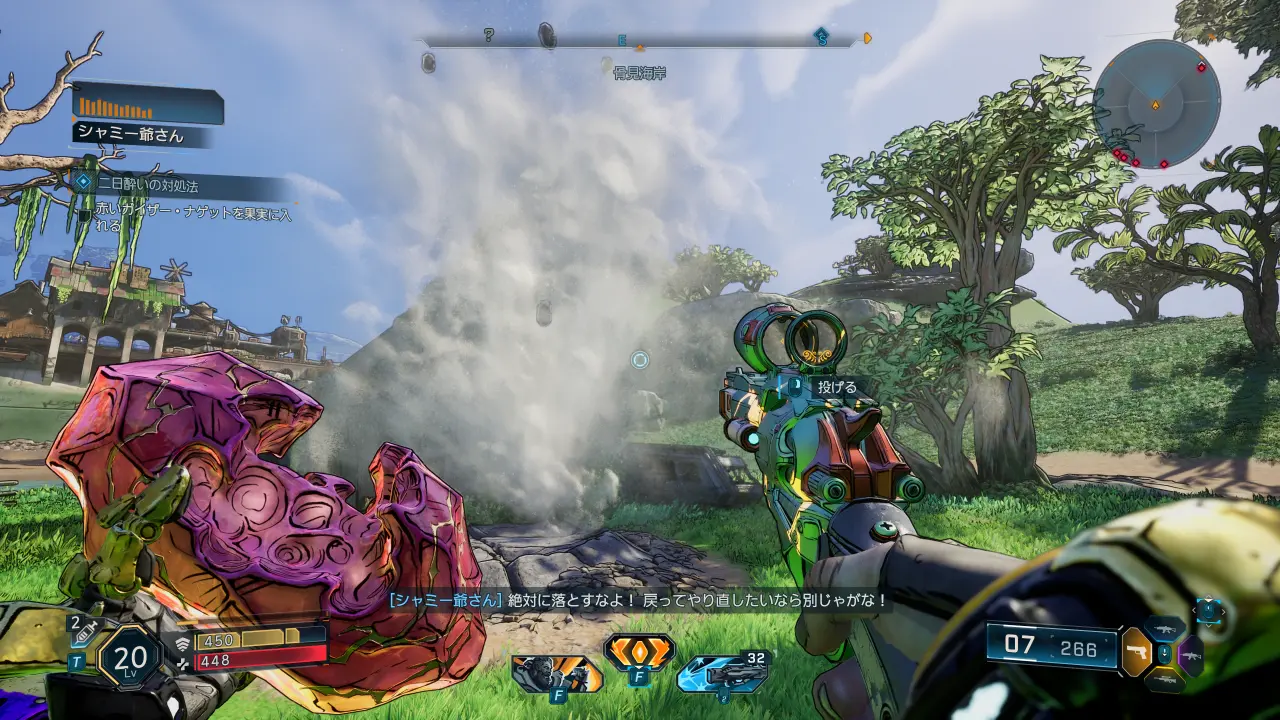最初はクラッチの巣へ行き、崖に張り付いている果実をグラップルで4つ集める。襲ってくるクラッチは無視しても構わない。果実を集めたら一度爺さんのところに戻り、果実を置いて割る。