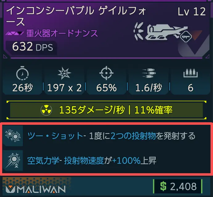 アンコモン以上の重火器には、追加の効果を付与する様々な特性が付与される。