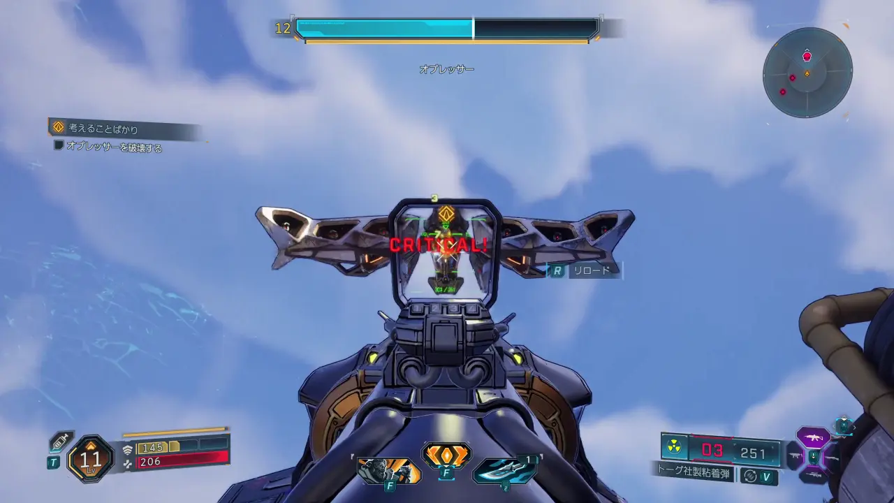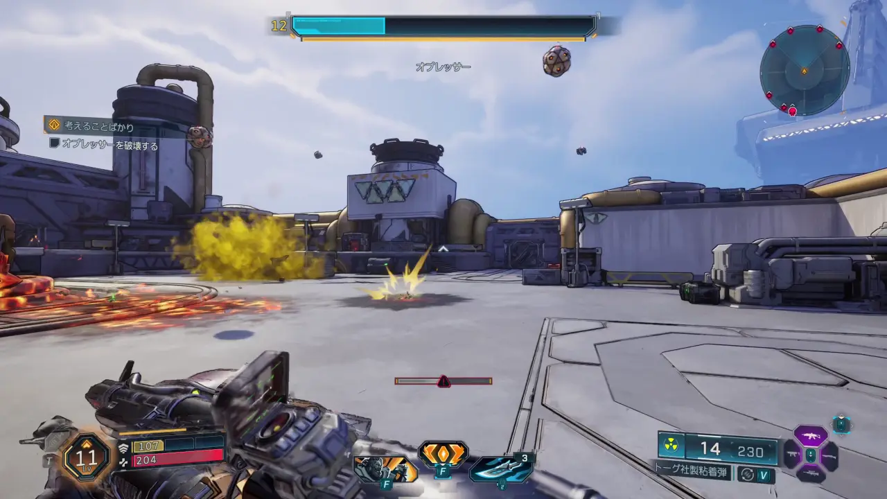 オプレッサーの弱点は本体下部のコアのようなもの。距離が遠いので、精度の高いアサルト・ライフルやスナイパー・ライフルがあると戦いやすい。また、対シールド用に