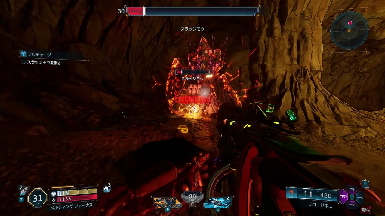 下まで滑り降りるとボスのスラッジモウが出現するので倒す。スラッジモウはヴォルト・ハンターと距離があくと地面に潜り、近くまでよってから飛び出してくる。飛び出した後には触手を降って攻撃してくるので、ダッシュで後ろに避けて反撃しよう。弱点は触手の節。