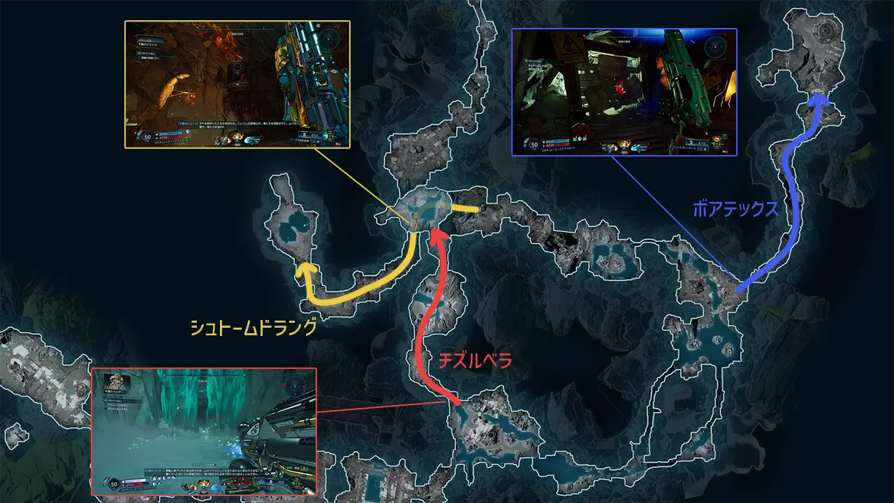 その後のリッパーがいるエリアでは、進行方向右手に板で封鎖された通路があり、手前に落ちているエコー・ログを聞いた後に爆発物を撃てばボアテックスの居場所に繋がる通路を進めるようになる。