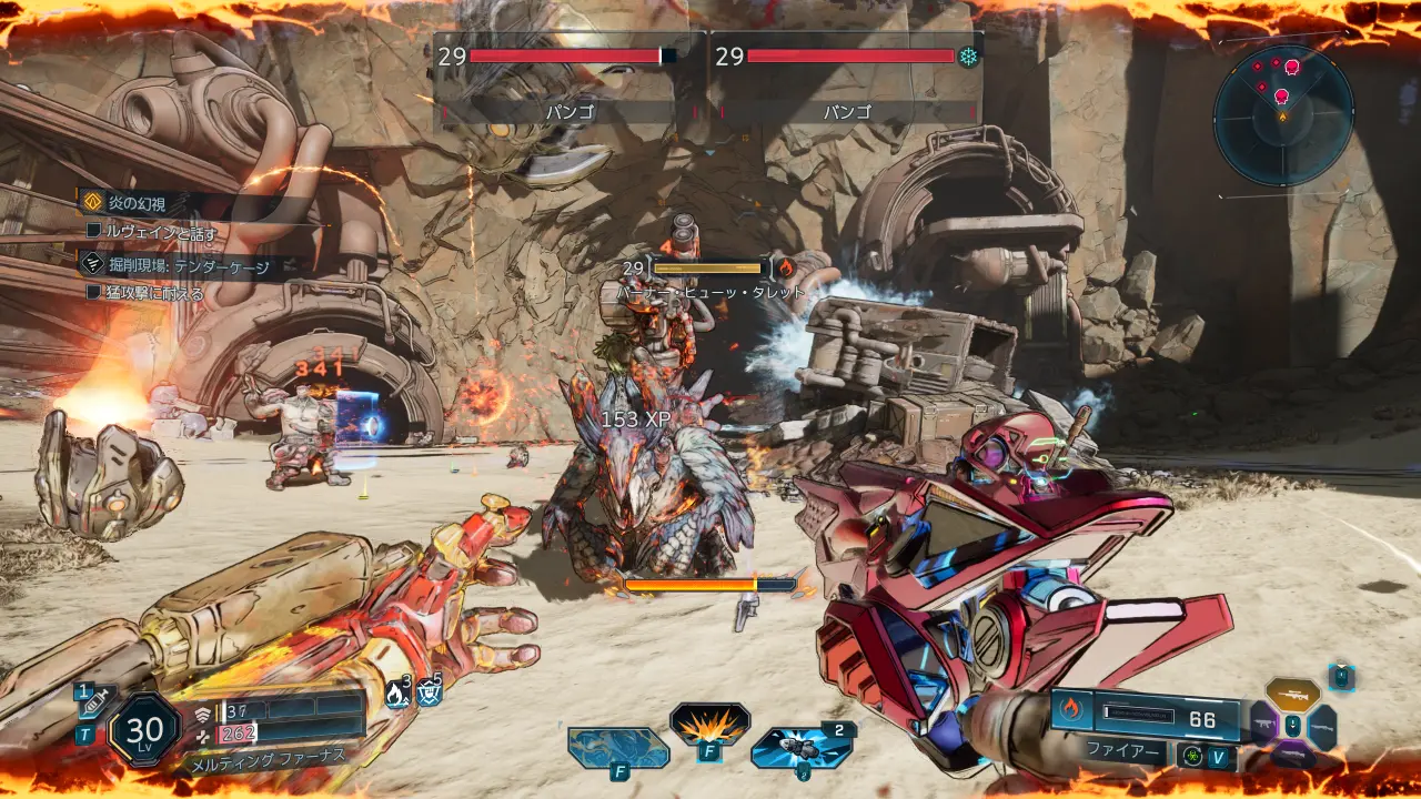 両者の背中に搭載されたタレットがかなり厄介なので、まずは遮蔽物を利用して動きの鈍いバンゴからの射撃を防ぎつつ、接近してくるパンゴのタレットを破壊するといい。パンゴを倒したら、同様にバンゴのタレットも破壊してとどめを刺そう。