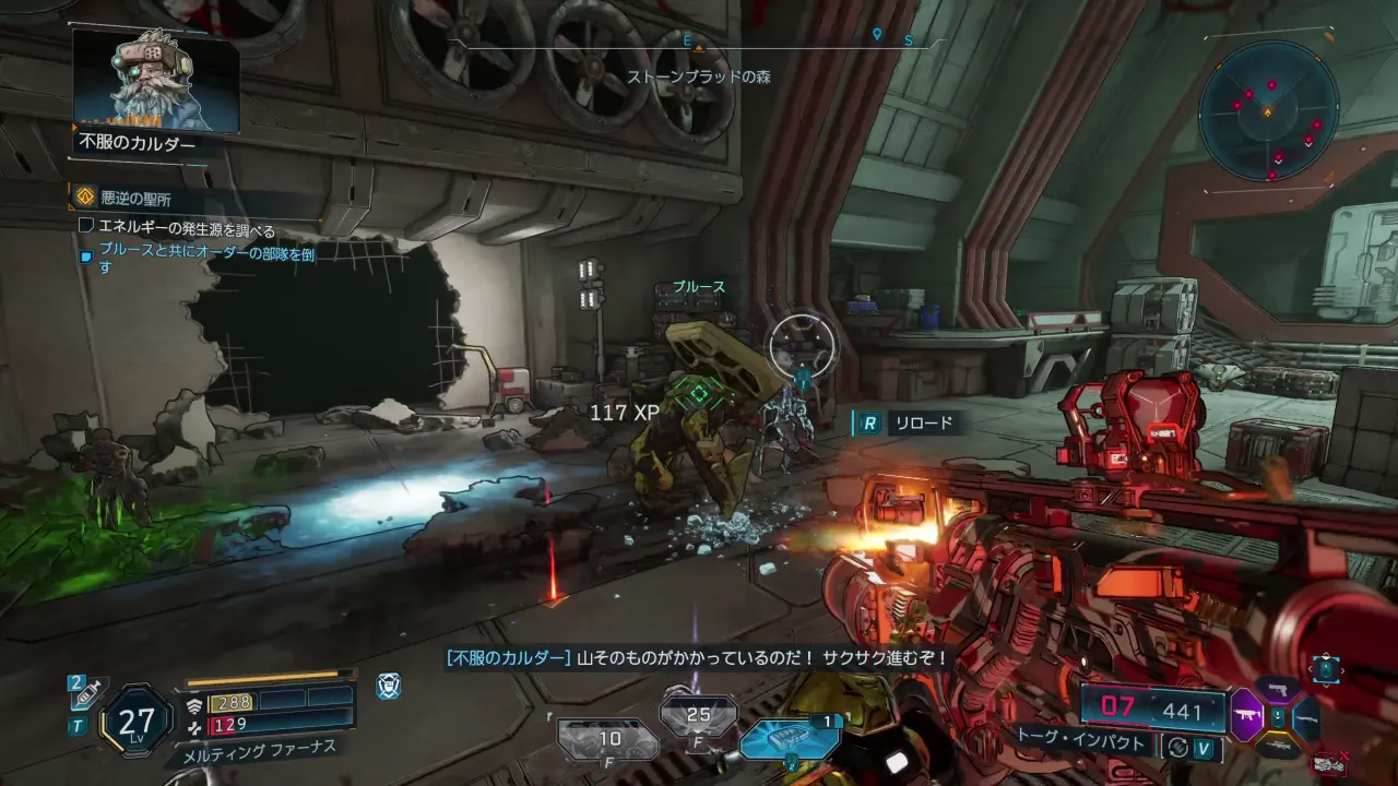 変電所の中に入ったらオーダー兵を倒しながら進み、フェーズバリアによって道が塞がれているエリアまで行く。そこで敵を倒すと不服のカルダーから壁際に行くよう指示されるのでマーカーにしたがって移動する。