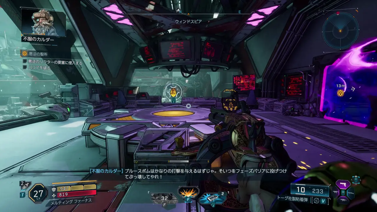 要塞への侵入に成功したら、ブルースの残骸を探してコアを回収する。コアを回収したらエンジニアリング・ベイに行き、回収したコアを端末に差し込む。すると生成装置からブルースボムが入手できるようになるので、これをグラップルで拾ってフェーズバリアに投げつける。