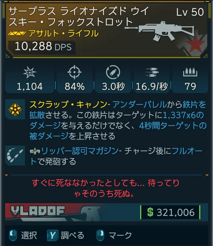 オーバードライブ(このページの写真の銃)では、フルオートで撃てるサブマガジンに切り替える。フレーバーテキストが、「どいつから穴を開けてやろうか!?」になる。