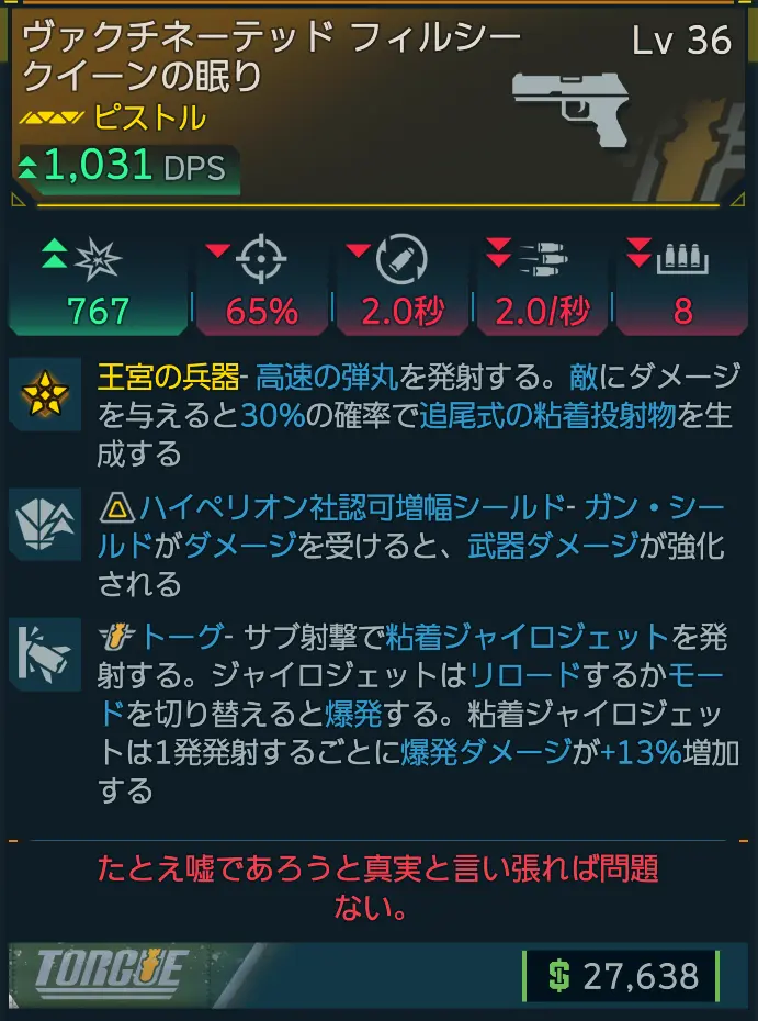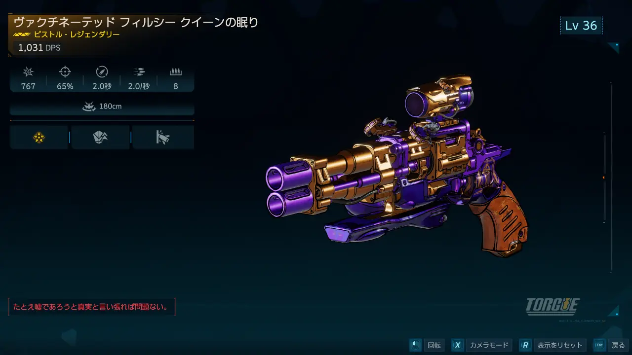 トーグ製のレジェンダリー・ピストル。カルカディア・バーンでのメイン・ミッション「炎の幻視」で登場するリッパー・クイーン、カリスがドロップする。