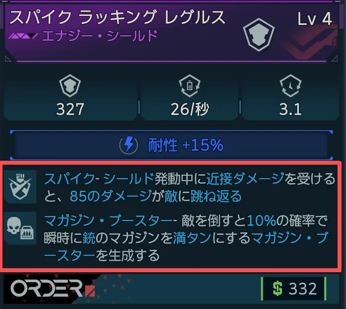 ![]() スパイク | 共通 | スパイク | シールド発動中に近接ダメージを受けると、nのダメージが敵に跳ね返る |
