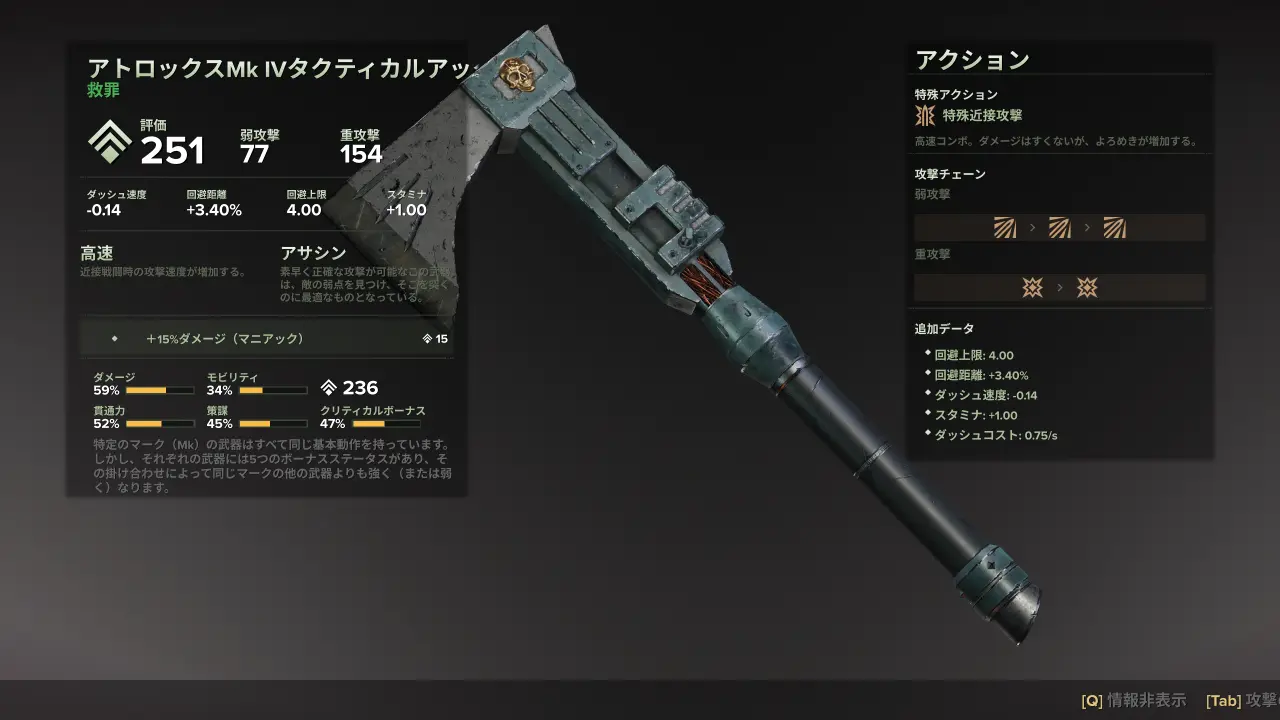 アトロックスMk IVタクティカルアックスは『Warhammer 40,000: Darktide』で使用可能な近接武器の1つ。