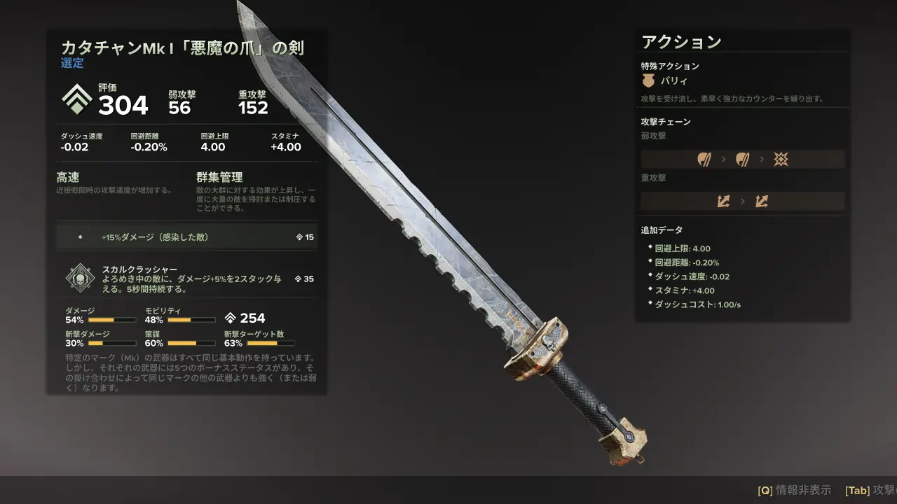 サイキネティックの初期武器でもある汎用的な剣で、弱攻撃、重攻撃共に複数の敵を攻撃しやすいのが特徴。特に重攻撃はコンボが全て広範囲の横薙ぎになっているため、大群をコントロールしやすい。