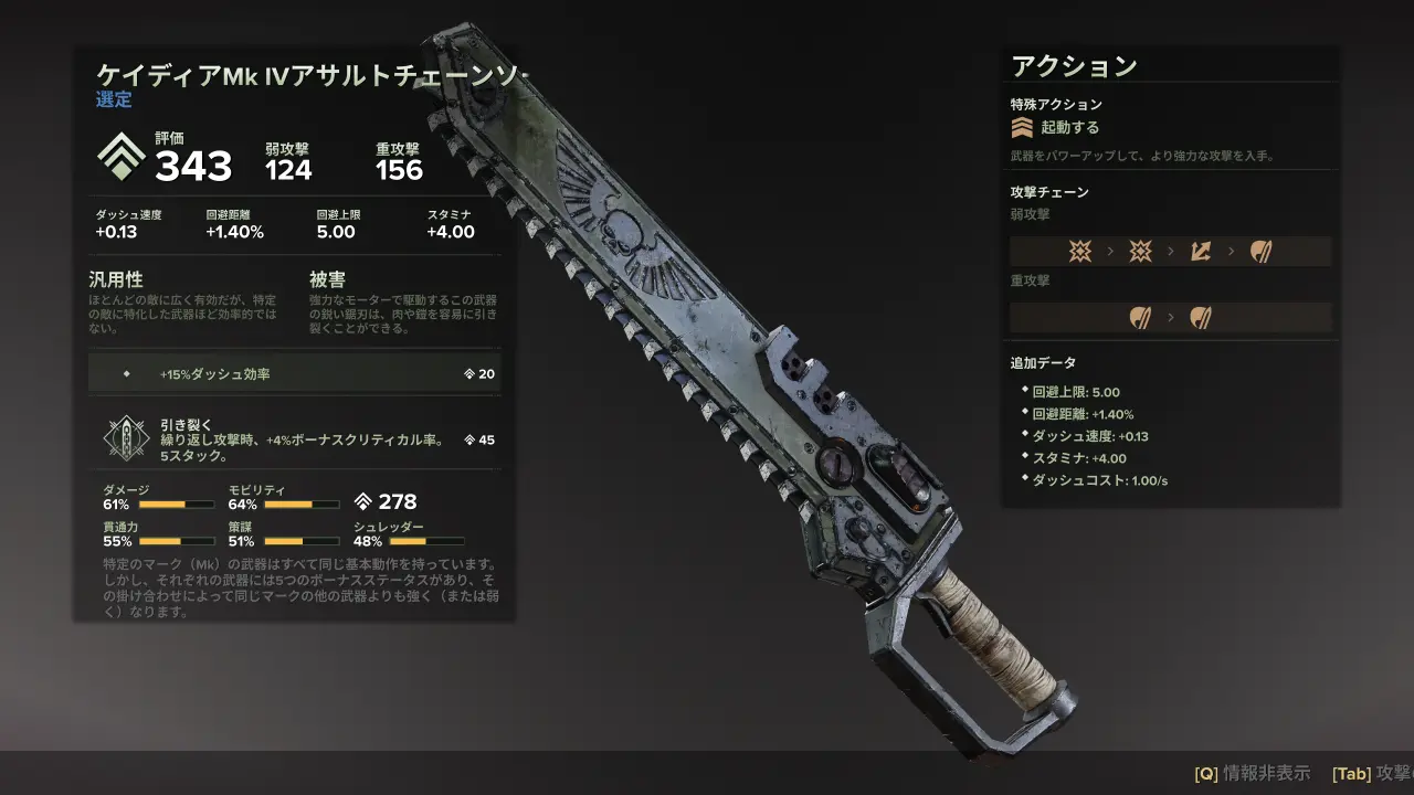 ケイディアMk IVチェーンソードは『Warhammer 40,000: Darktide』で使用可能な近接武器の1つ。