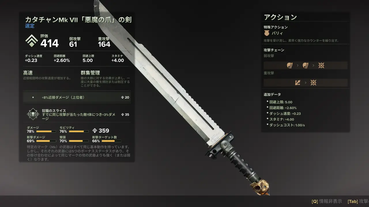 カタチャンMk I「悪魔の爪」の剣とほぼ違いはないが、重攻撃の2発目が