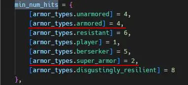 例えば、総ペレット数13のローブリンガーMk VI戦闘ショットガンの腰だめ撃ちでグローナーにペレットが1発だけ当たったとする。この場合、画像のようにアーマー未装着 (unarmored) の敵に対する最低ヒット数は4に設定されているので、最終的には4発のペレットがヒットしたとしてダメージが計算される。