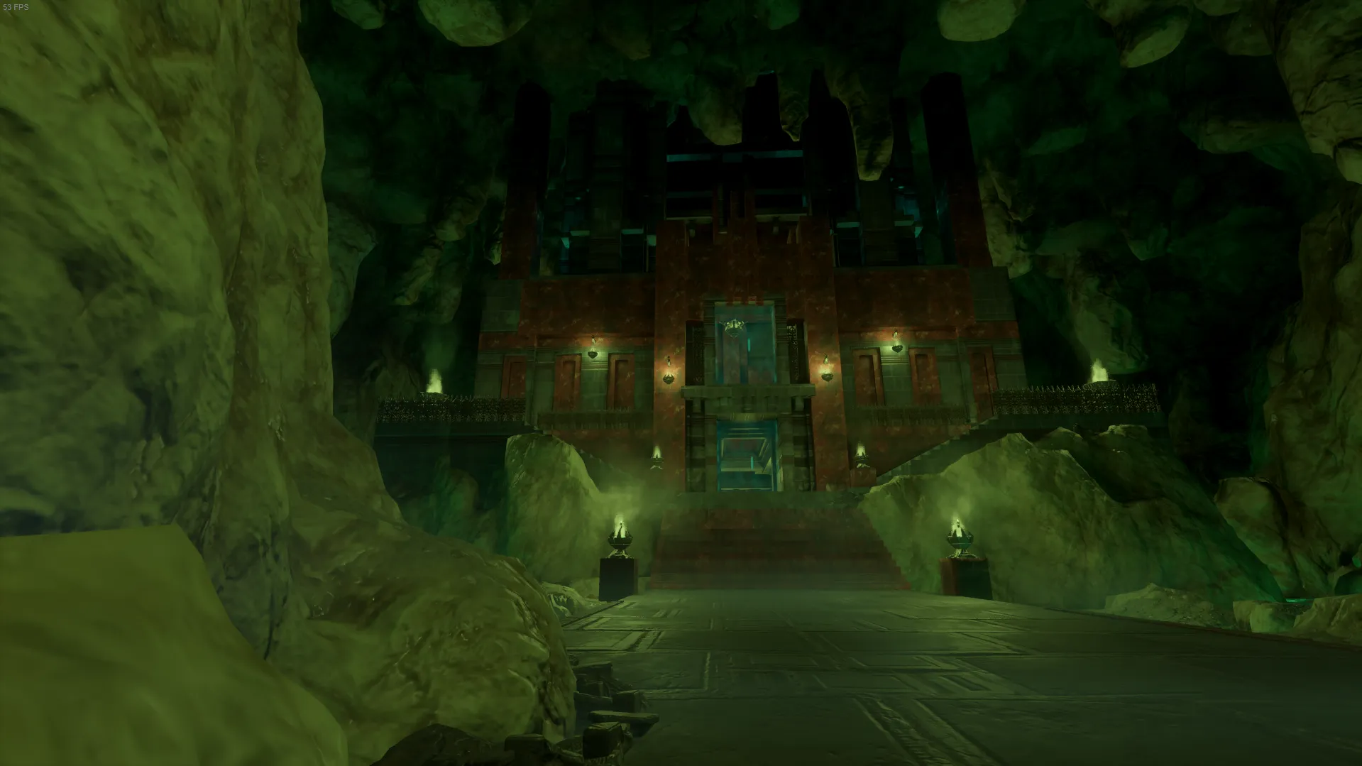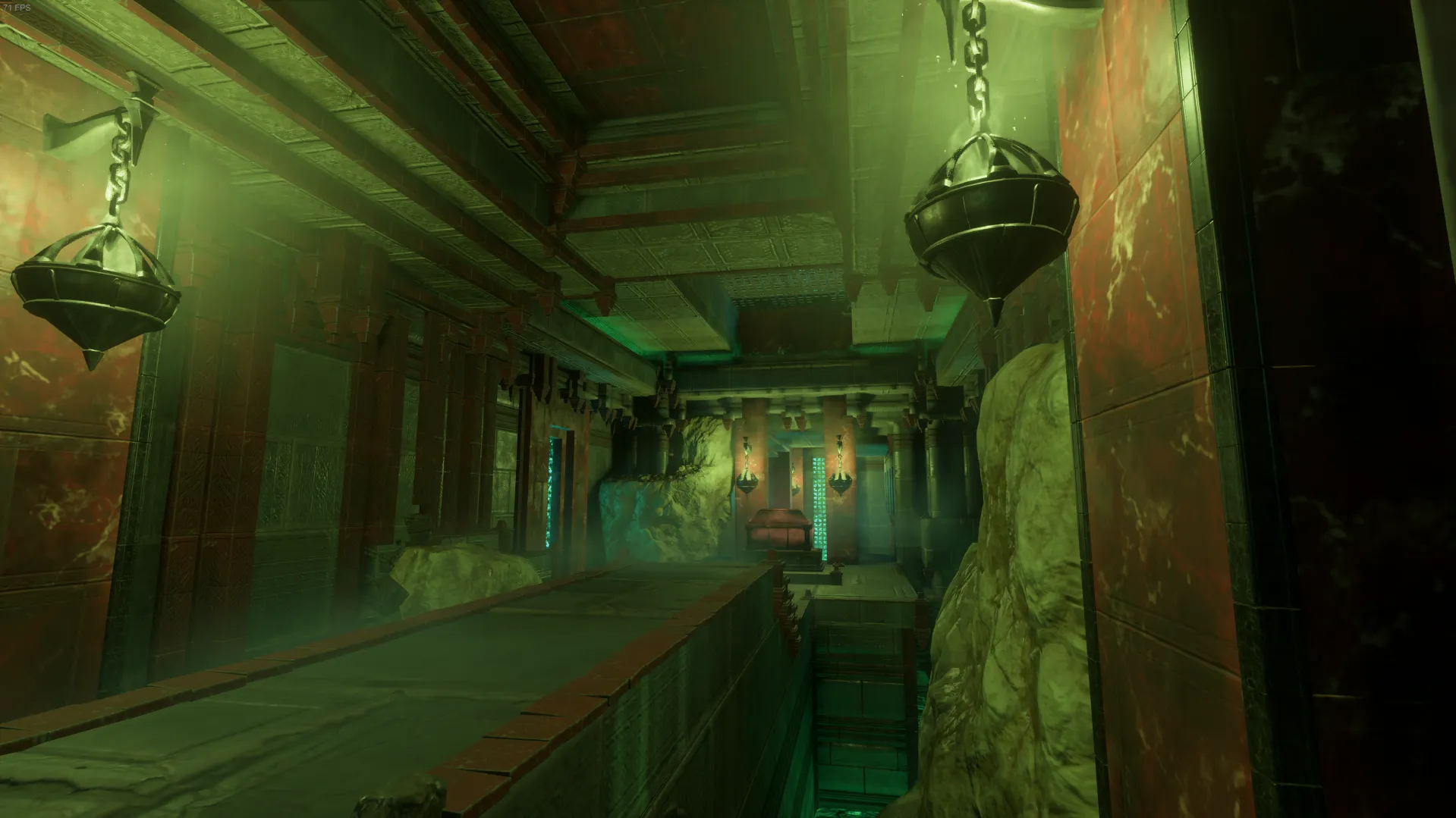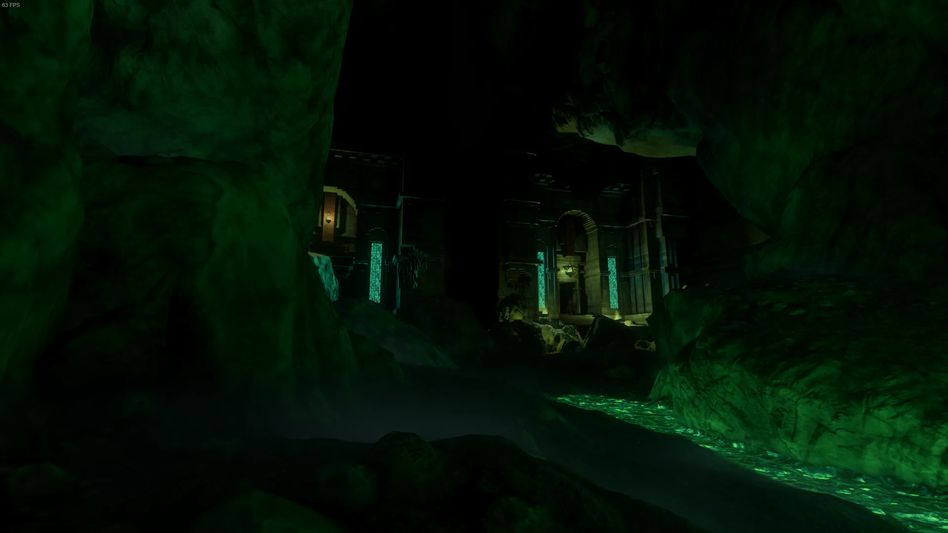 先に進むと斜め下に下っていく緑色の洞窟が目に入る。
