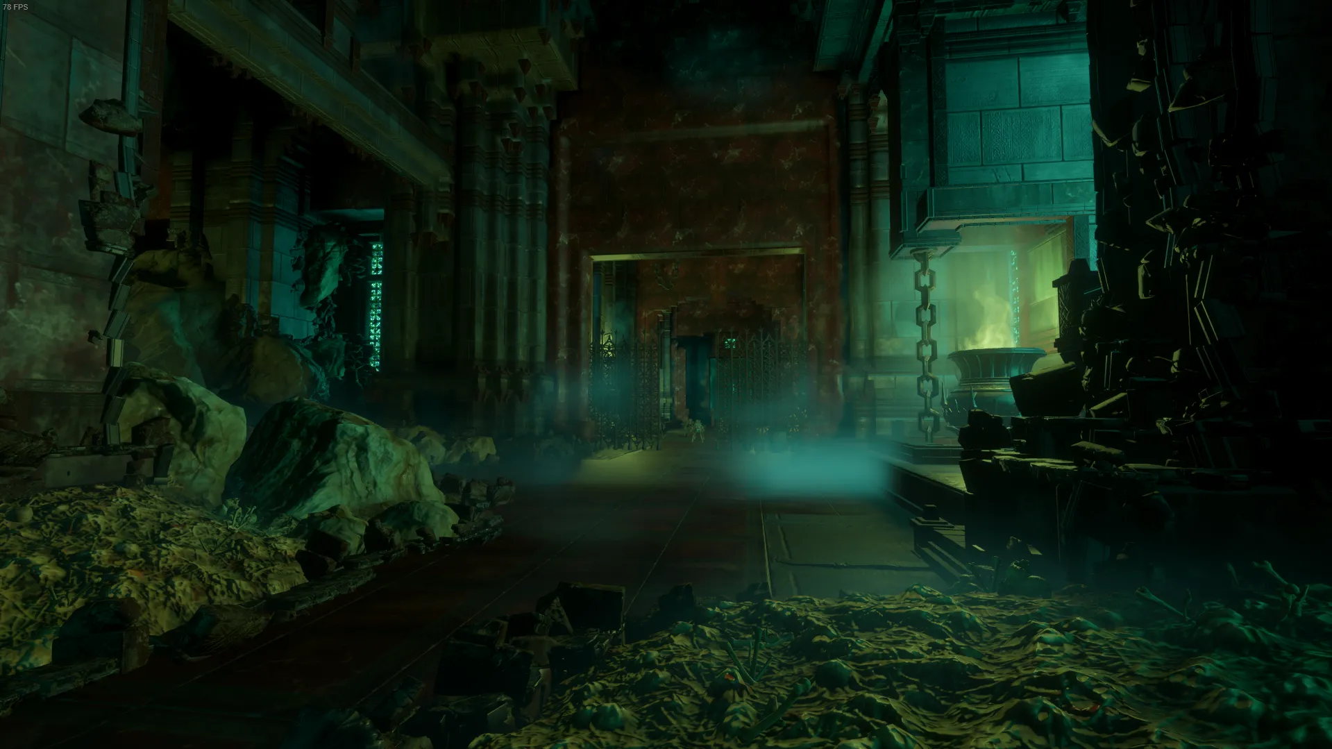 更に道なりに進むと、正面と右手にそれぞれ鍵付きの大きな扉が見える。