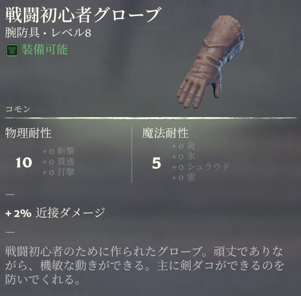 ![]() 戦闘初心者グローブ | 8 | 剣士 | 10 | 5 | +2% 近接ダメージ | 鍛冶師 | |
