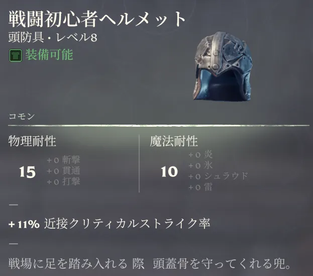 ![]() 戦闘初心者ヘルメット | 8 | 剣士 | 15 | 10 | +11% 近接クリティカルストライク率 | 鍛冶師 | |