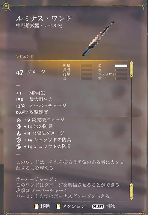 ![]() ルミナス・ワンド | 11~25 | 150 | エピック | 100% | 1:炎魔法ダメージ | ||||||||