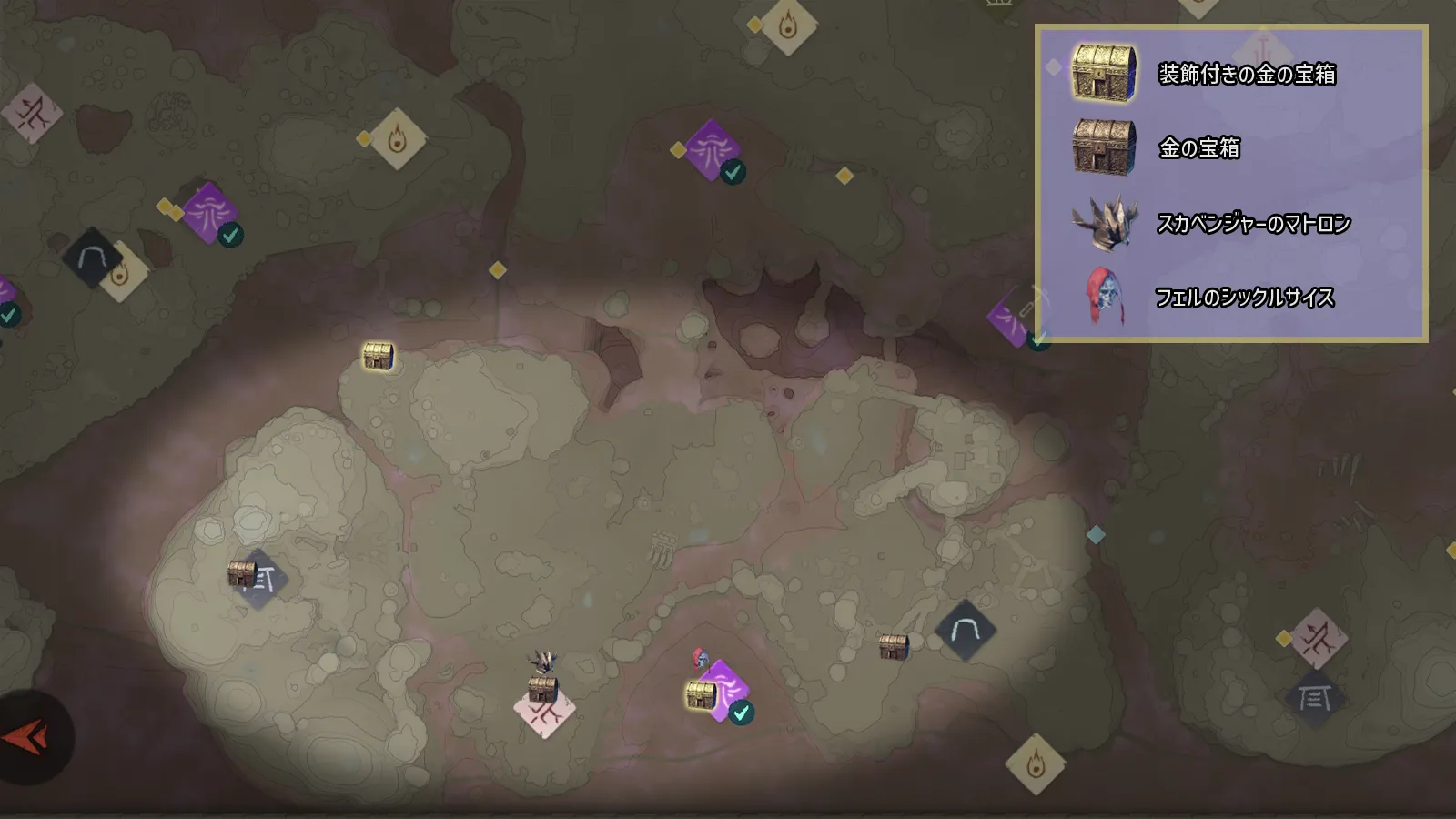 最終盤の場合、キンドルウェイストの最西端 (マップ右下の少し左) に金の宝箱とボスモンスターが集中しているので、そこで各所を回るなりリログを繰り返すなりするといい。