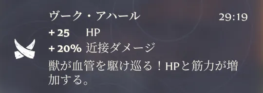 バフの効果は「+25 HP」「+20% 近接ダメージ」で効果時間は30分。