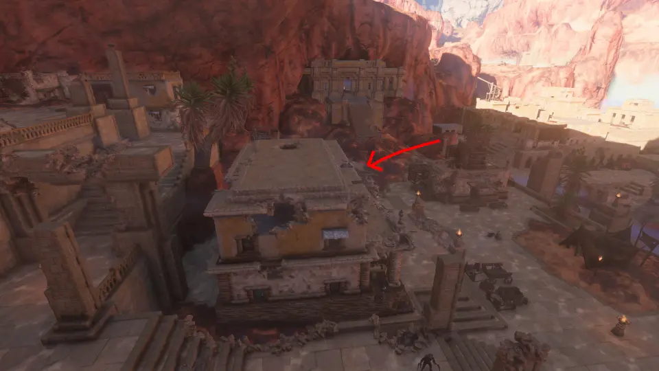 酒場はお化け太陽の神殿の正面にある、天井に穴の空いた大きな建物。砂漠都市の壁の入った宝箱は1階のベッドのそばにある。