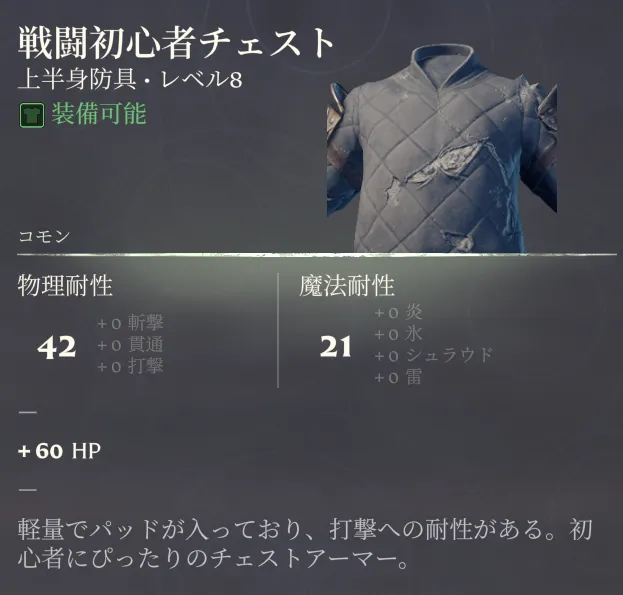 ![]() タンクチェスト | 13 | タンク | 61 | 30 | +12 物理耐性 | 鍛冶師 | |