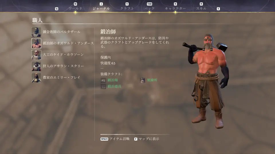 現在の職人たちの環境は、インベントリのジャーナルタブから見られる「職人」の項目で確認できる。