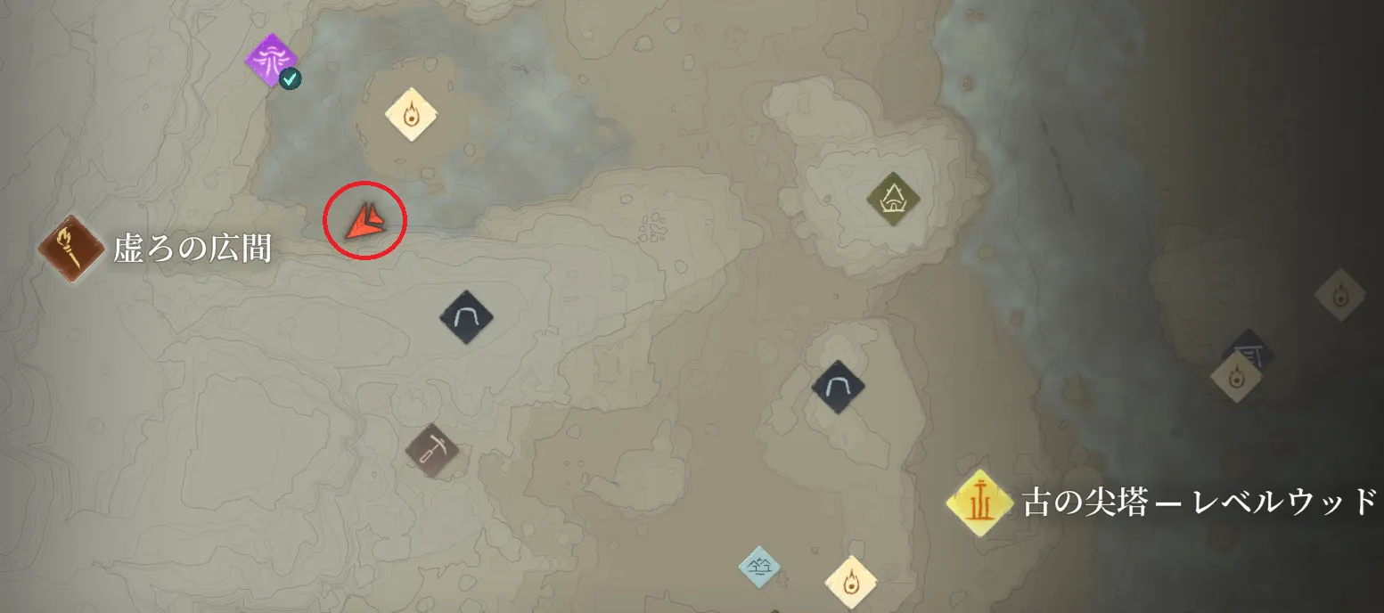 レベルウッド北西の端に位置するが、アイコンの位置に直行しようとしても崖に阻まれて辿り着けない。