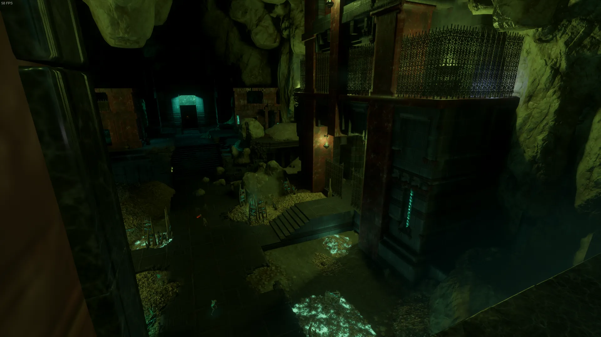 先に進むと斜め下に下っていく緑色の洞窟が目に入る。