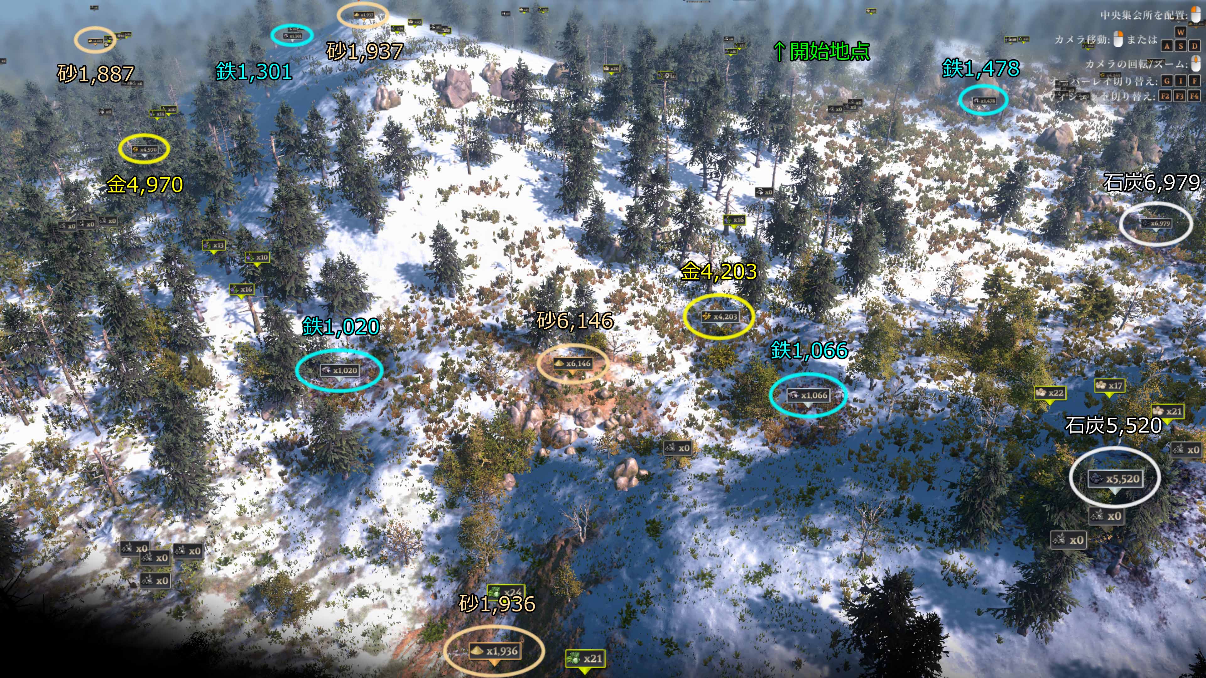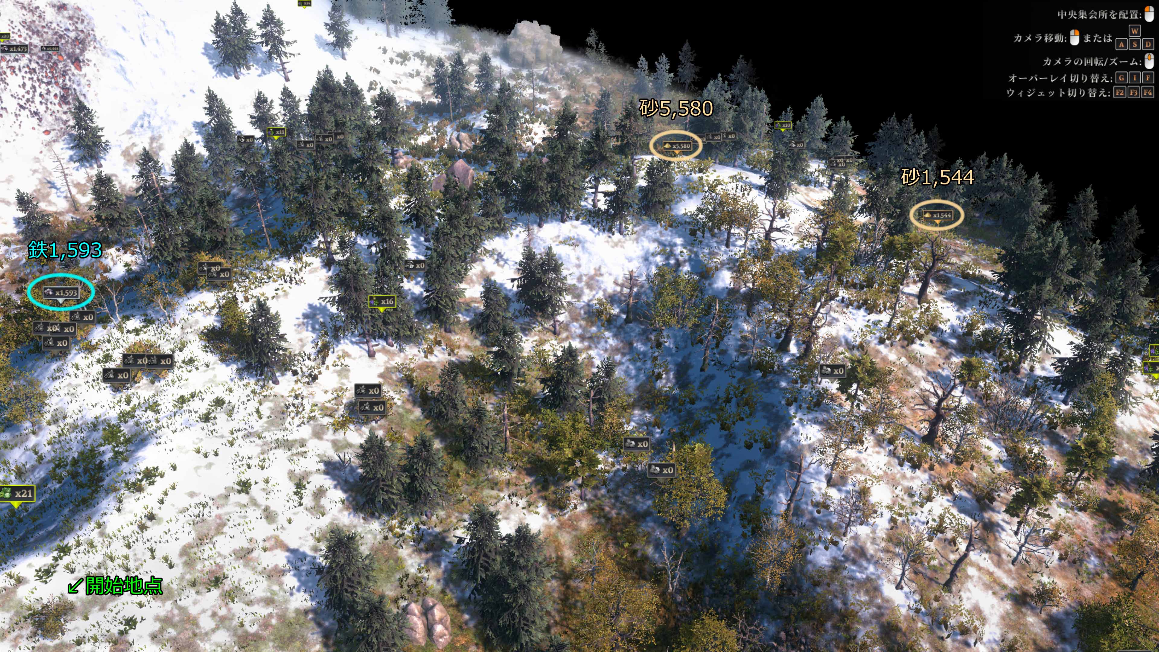 同じく北西側に小さな池が2つありましたが、ゲーム開始時点の見える範囲では水場が全くありません。