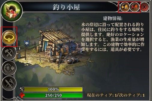 | 釣り小屋 | 1 | 住民に指定した範囲の水辺で釣りをさせる。 | 3x2 | 1 | |