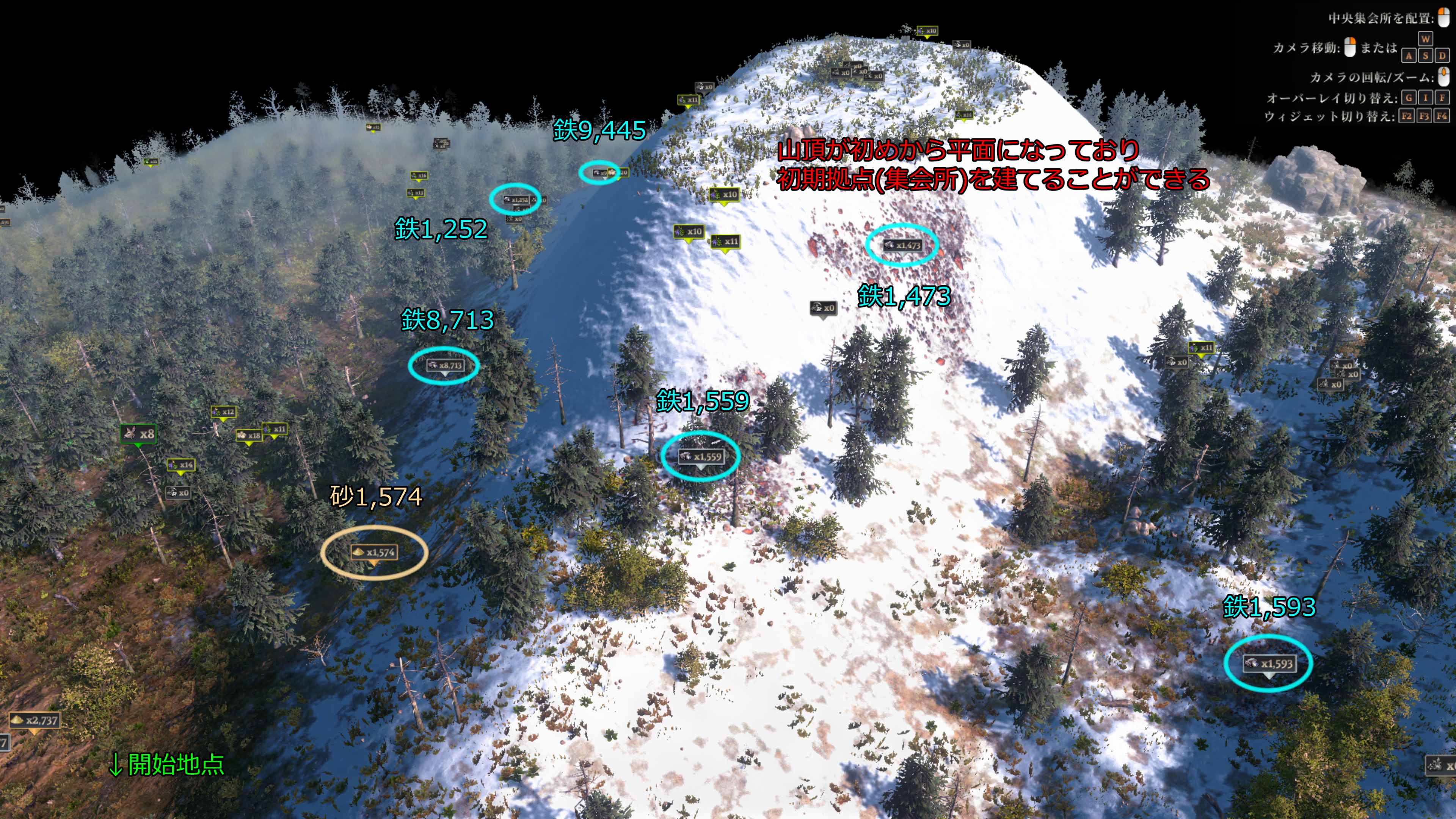 開始地点のすぐ上に山頂が平らな山があり、その山頂に初期拠点(集会所)を建てることができます。