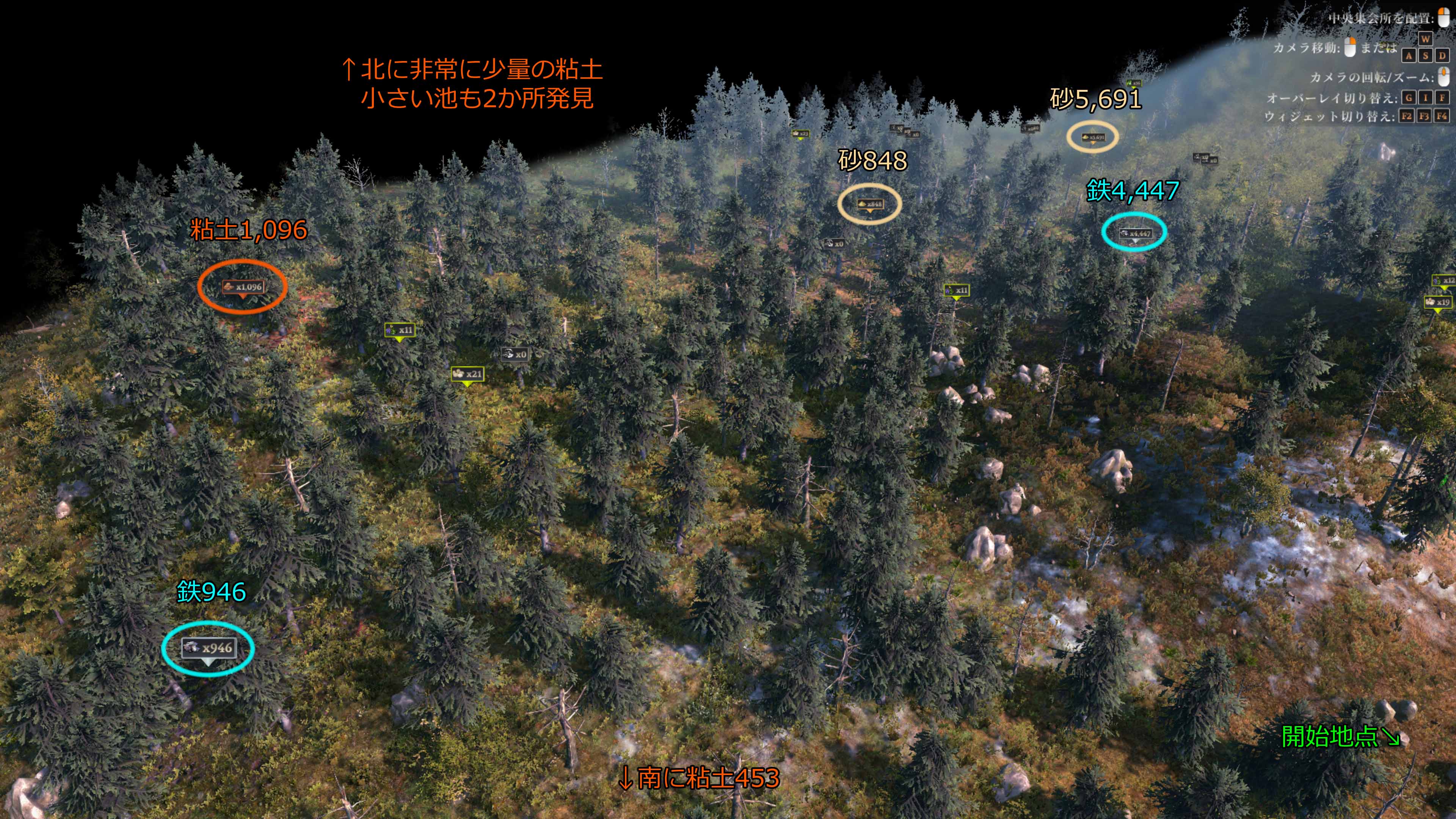 同じく北西側に小さな池が2つありましたが、ゲーム開始時点の見える範囲では水場が全くありません。