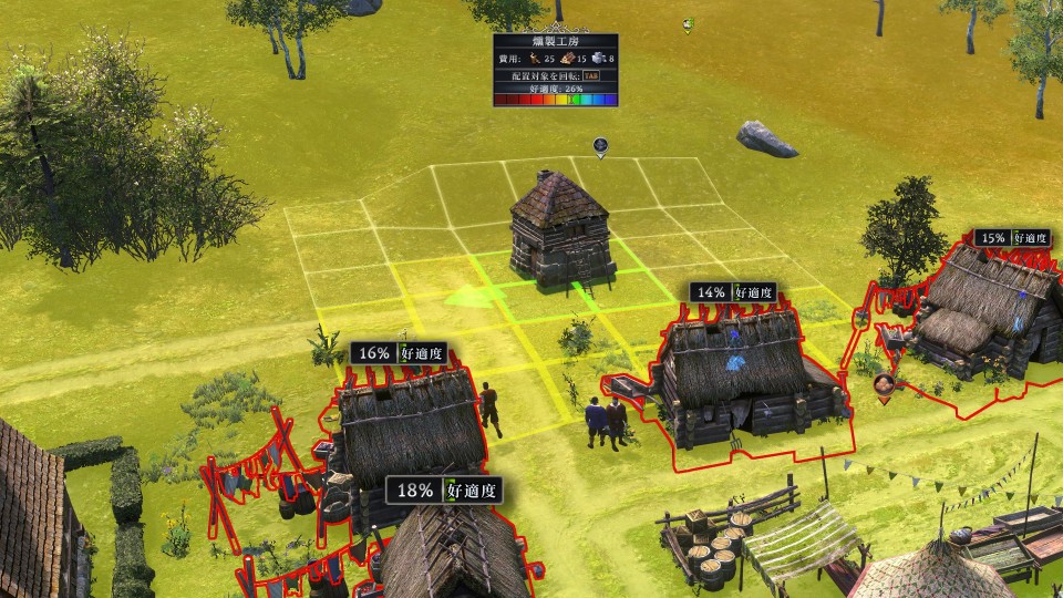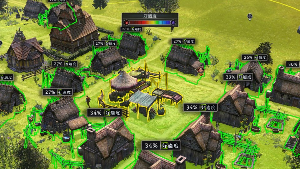 集落を構築するにあたって、基本的にはこの好適度を高く維持するために居住区域と生産区域を分けて整備する必要がある。