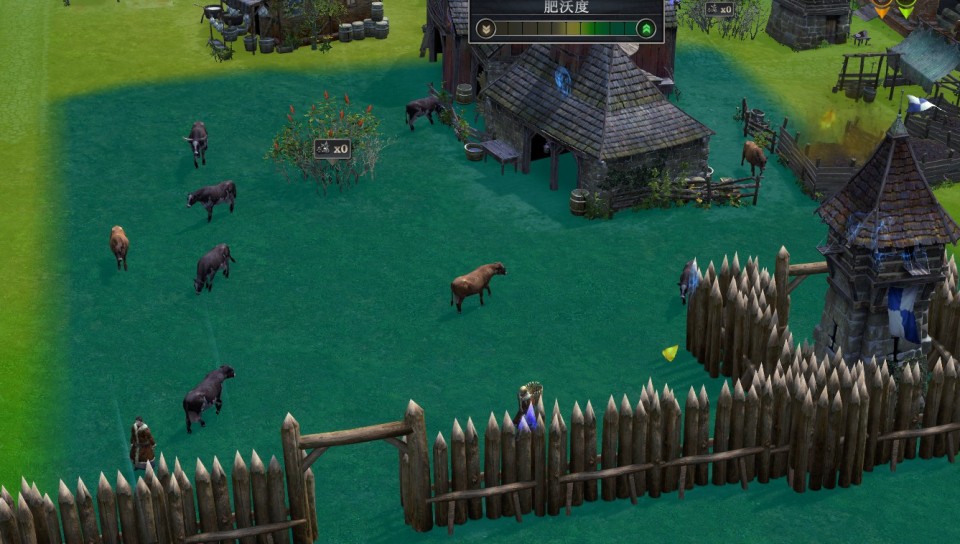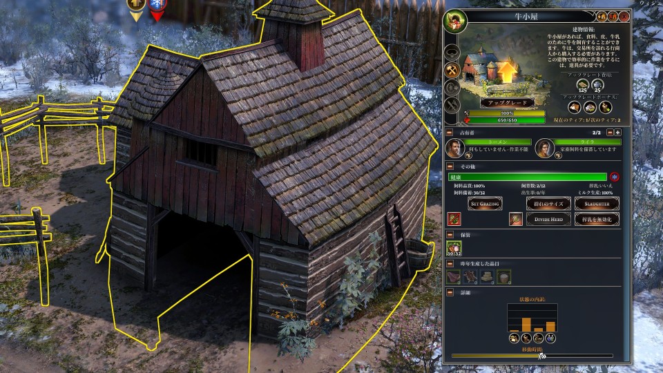 中央集会所をティア3にアップグレードすると牛小屋 (牛舎) を建設できるようになり、牛の群れを管理して肉や毛皮、獣脂、そしてミルクを大量に生産可能になる。