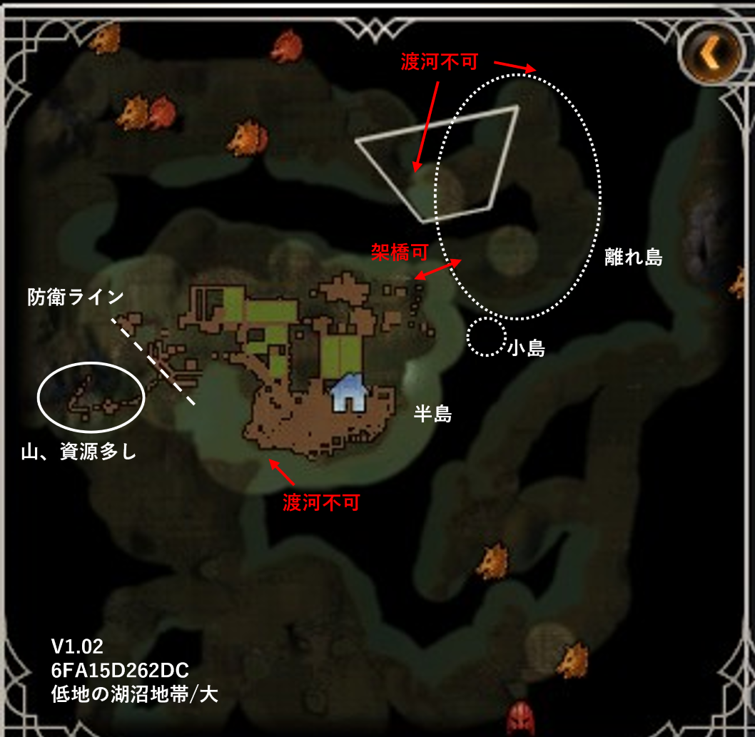 防衛ラインのちょっと先に山岳地帯があり、資源生成されやすいと思います。マップ生成時には見えません。