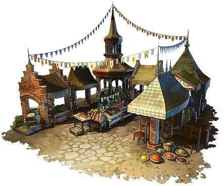 市場をアップグレードした建物。市場と比べて影響範囲が広くなり、1件あたりから得られる税収も上昇しているため、範囲内に建物を敷き詰めれば兵舎や施療所など維持費の高い建物も運用しやすくなる。