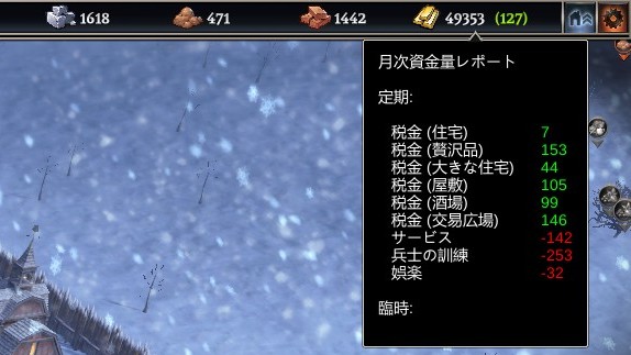 毎月の収支状況は画面右上の資金欄をマウスオーバーすると表示され、どの建物によってどれだけの税収が発生しているか、またどの建物にどれだけ費用がかかっているかを見ることができる。