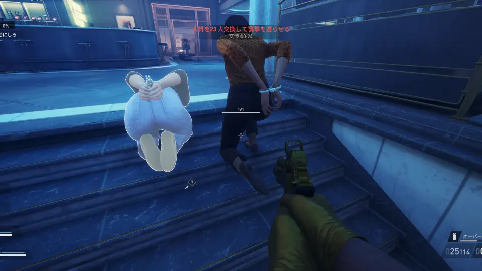 拘束した人質に近づいてインタラクトを長押しすると、あとを付いてくるよう命令できる。同時に複数の人質に命令を出すことはできるが、ついてくるのは最後に命令を出した人質のみで、あとはその場に立ったままになる。