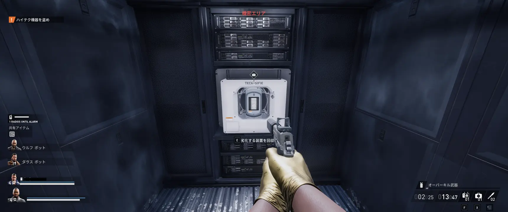 セキュリティを解除したらハイテク機器を取れるようになるが、ハイテク機器は取った瞬間から劣化が始まり、時間内に倉庫の冷蔵トラックに入れられないと価値が下がる。価値は2段階までさがり、その後は変わらなくなる。
