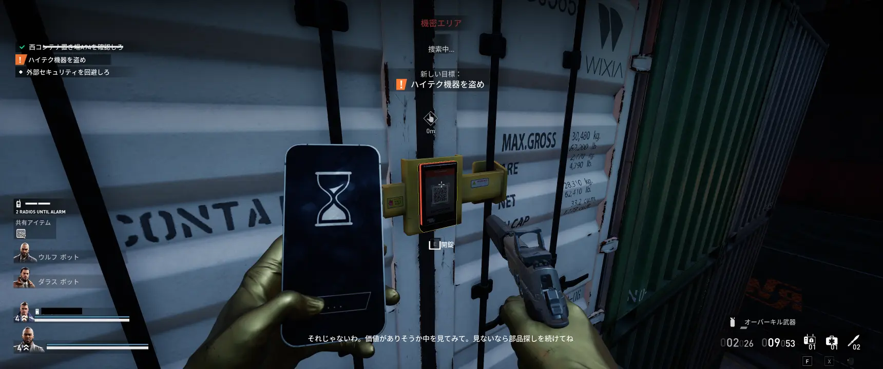 二次元コードを使って目的のコンテナを開けたら、内扉のセキュリティパネルをインタラクトし、表示されたGPSスポットの上に一定時間立ってセキュリティを解除する。