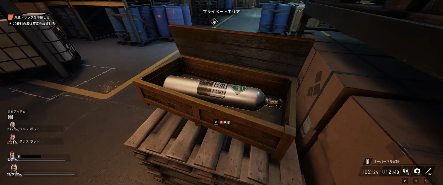 倉庫に入ったら、1階にある黄色の木箱を開けて液体窒素のボンベを探す。木箱は全部で4つあり、そのどれか1つにボンベが入ってる。倉庫に入って一定時間経過しても見つけられない場合、ボンベの入った木箱の位置がHUDに表示される。
