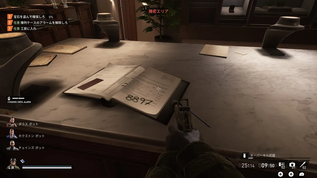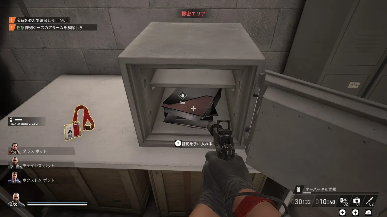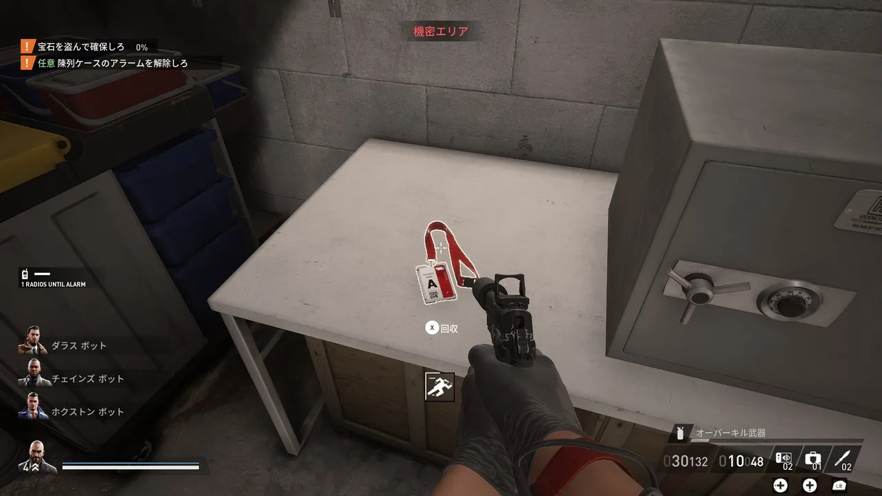 ステルスを維持したまま店内に展示された宝飾品を奪取する場合は、従業員対策のソーシャルエンジニアリングとカメラ対策のハッカー (エース) +セキュアループを取得しておこう。ただし警備員の視線は誤魔化せないので、ケースを開ける際や回収時は視線が通っていないことをしっかり確認すること。