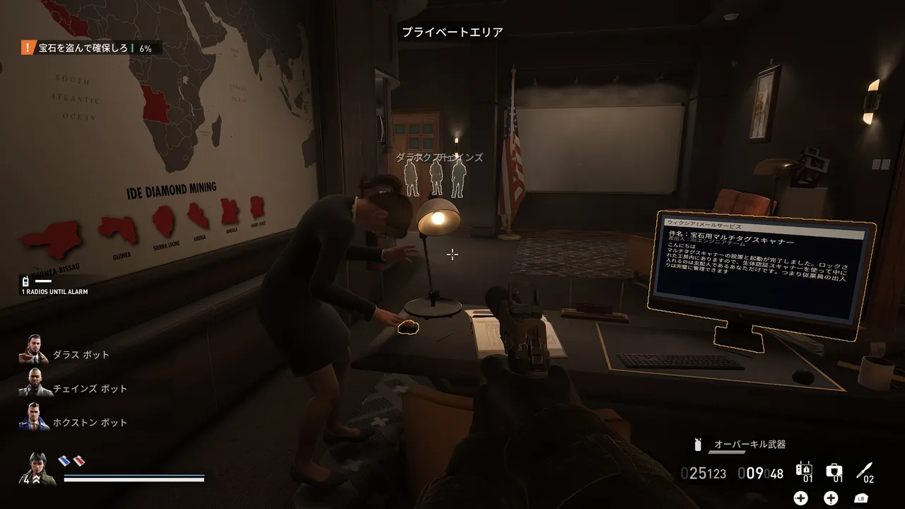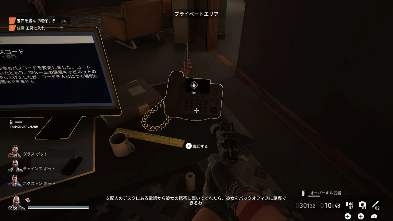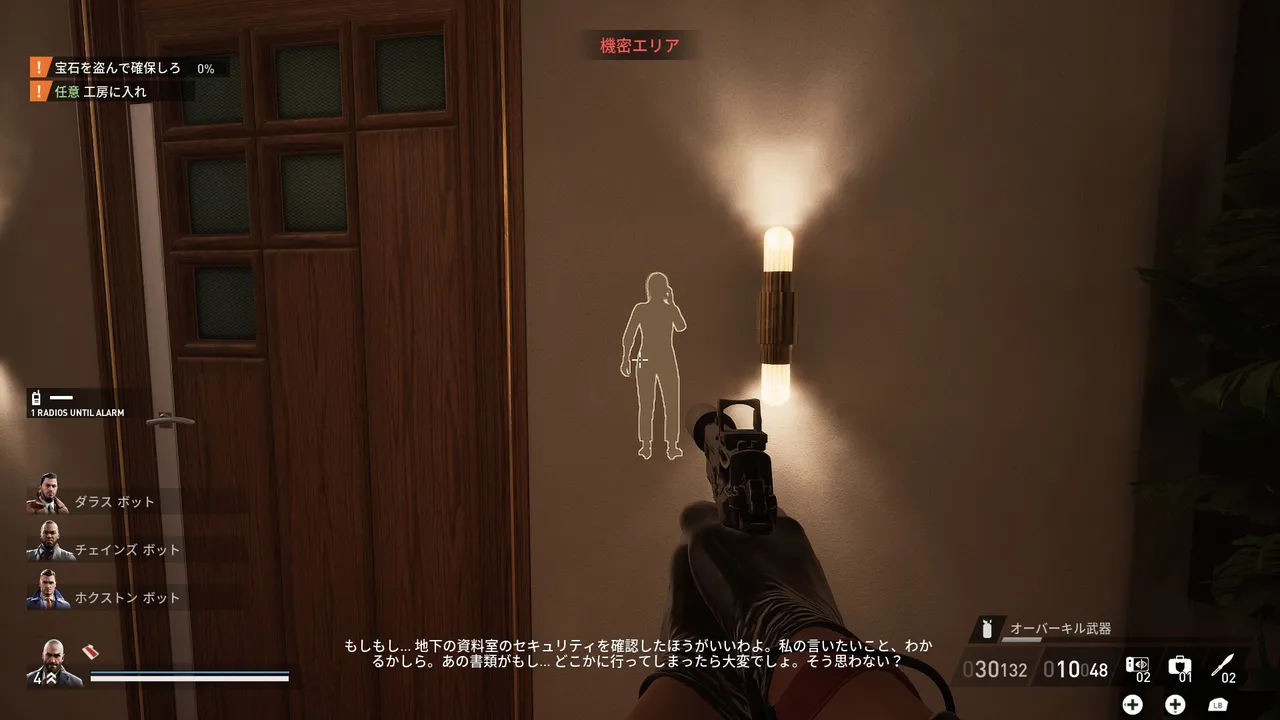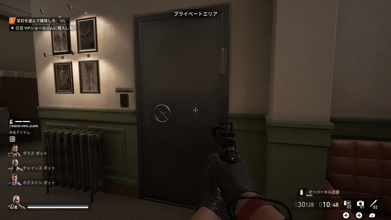 ステルスを維持したまま店内に展示された宝飾品を奪取する場合は、従業員対策のソーシャルエンジニアリングとカメラ対策のハッカー (エース) +セキュアループを取得しておこう。ただし警備員の視線は誤魔化せないので、ケースを開ける際や回収時は視線が通っていないことをしっかり確認すること。